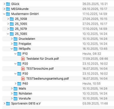 • für die Position 30 wird die zu druckende Datei »TESTbedienungsanleitung.pdf« in den Ordner P30 innerhalb des Ordners IWSpdfs abgelegt.