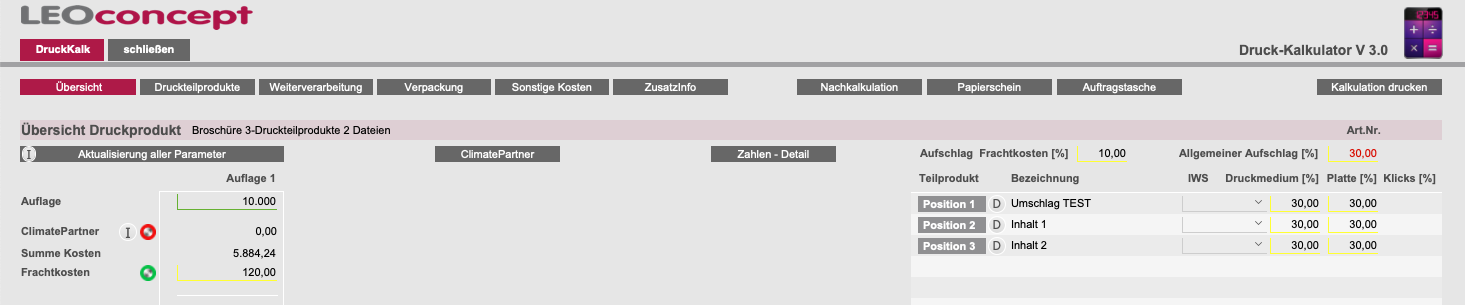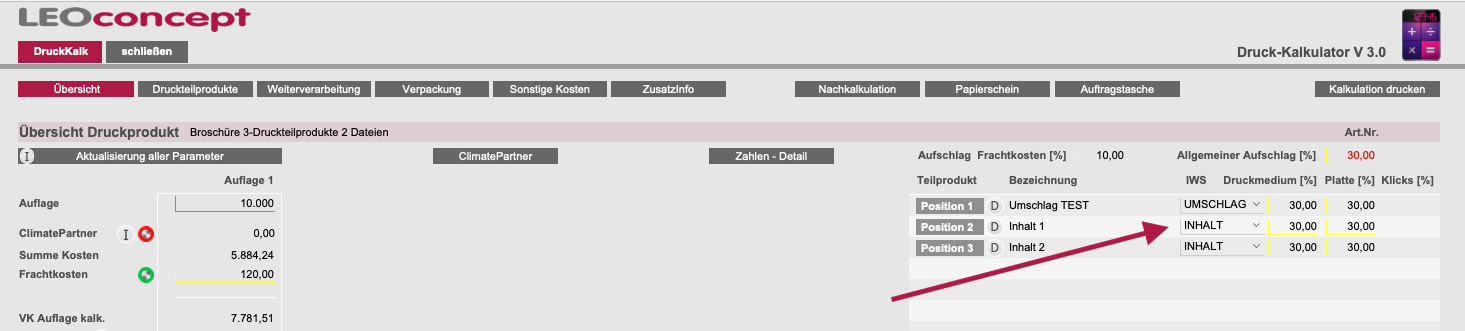 Und innerhalb der Kalkulation wurde die Information, welche Position nun UMSCHLAG und INHALT ist, übernommen und lässt sich in der Übersicht der Kalkulation anzeigen und bei Bedarf auch an dieser Stelle ändern.
