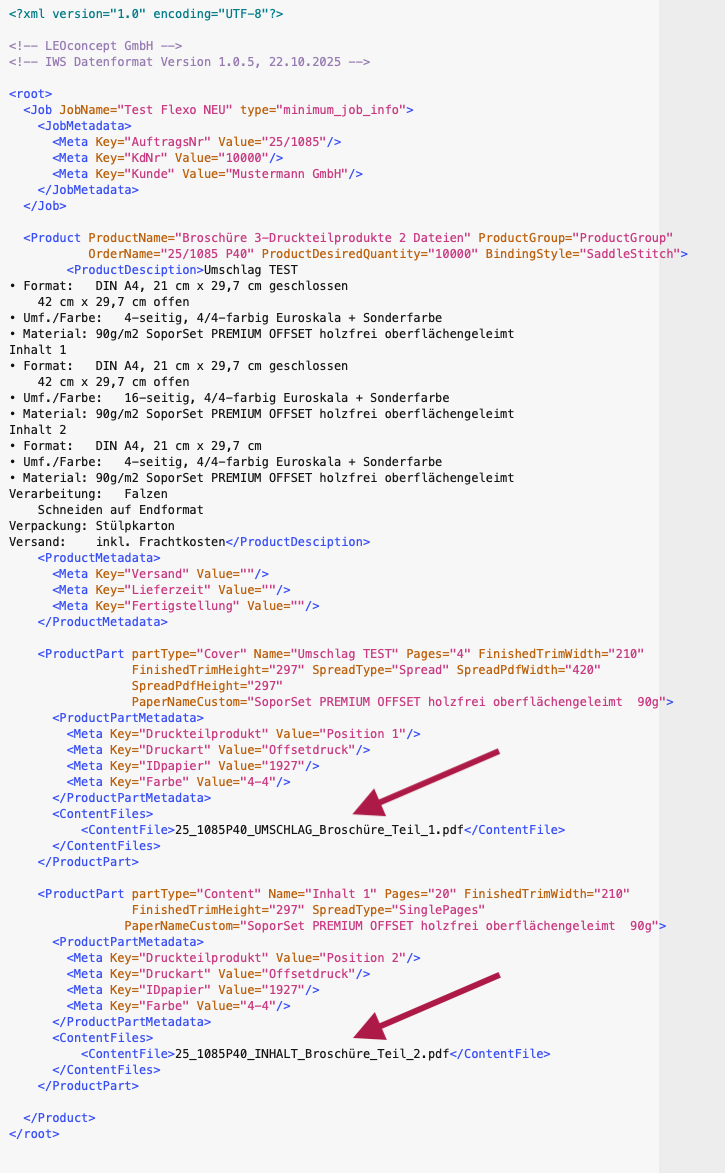 Ein Blick auf die XML zeigt, dass jeweils ein Druckteilprodukt für Umschlag und Inhalt übergeben wurde. Die Informationen finden sich jeweils im Bereich »ProductPart«.