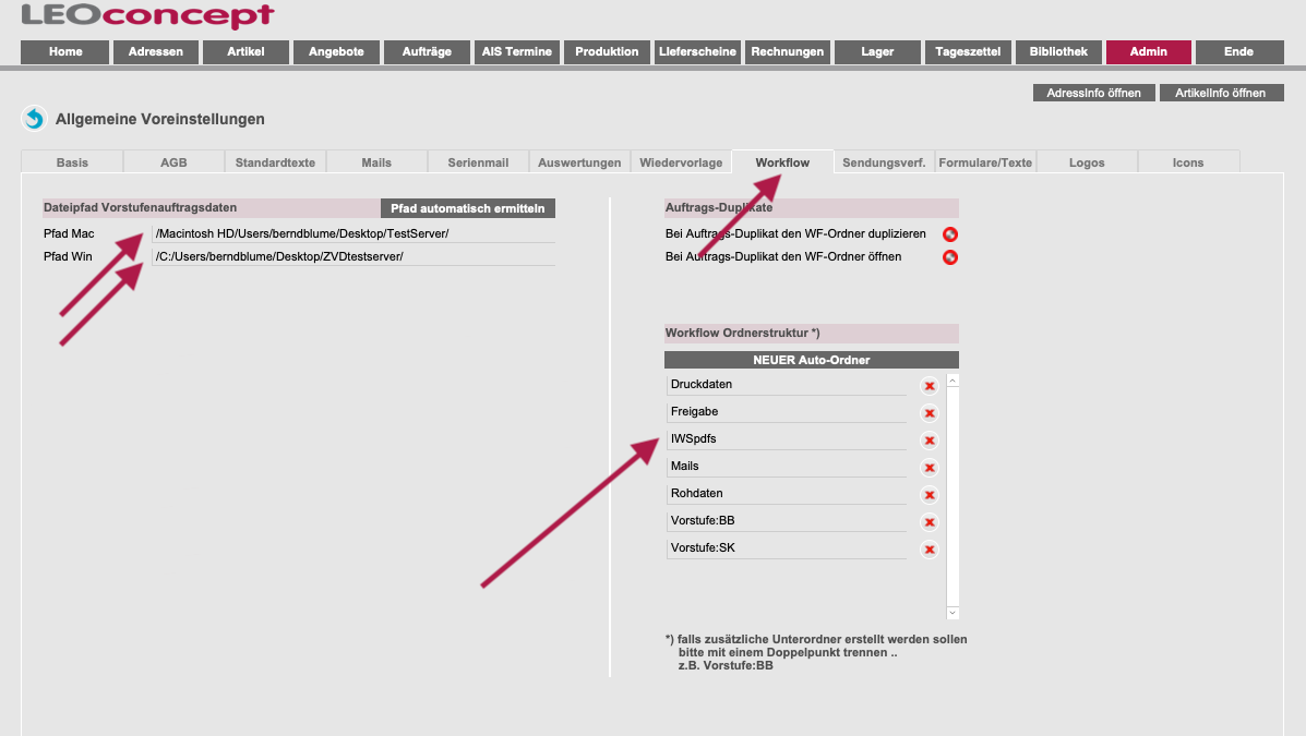 An dieser Stelle lässt sich auch die »Workflow Ordnerstruktur« innerhalb des Auftragsordners erstellen bzw. modifizieren.