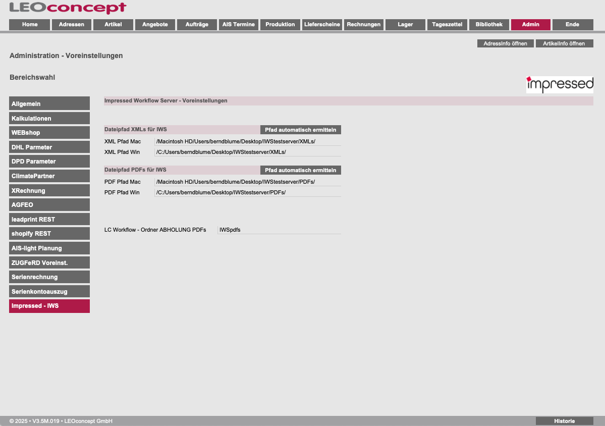 Das System benötigt die Pfadangaben für die Ordner auf dem IWS-Server ... es sind die Ordner für die Ablage der PDFs sowie der XMLs.