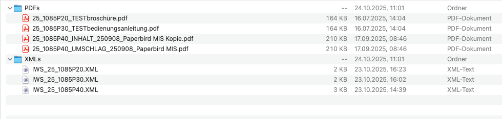 Man erkennt die XML »IWS_25_1085P40.XML« sowie die beiden PDFs für Inhalt und Umschlag, die ebenfalls mit der Kennung für die Auftragsposition versehen wurden