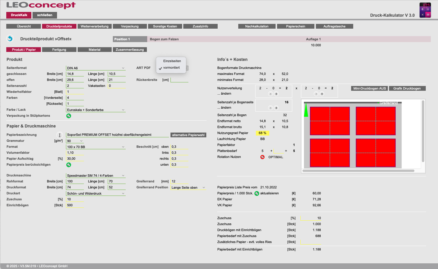 - eine Information über die Art des PDFs. Hier stehen zwei Varianten zur Auswahl, die über ein PopOver zur Verfügung gestellt werden - vormontiert oder Einzelseiten