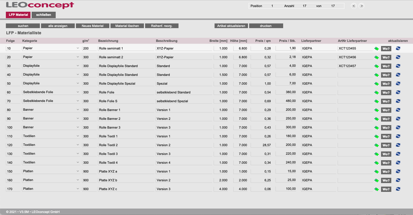 Als Beispiel hier ein Blick auf die Materialliste. Beliebig viele Materialien lassen sich erfassen. Um die spätere Auswahl übersichtlicher zu machen, werden die Materialien jeweils entsprechenden Kategorien zugeordnet.