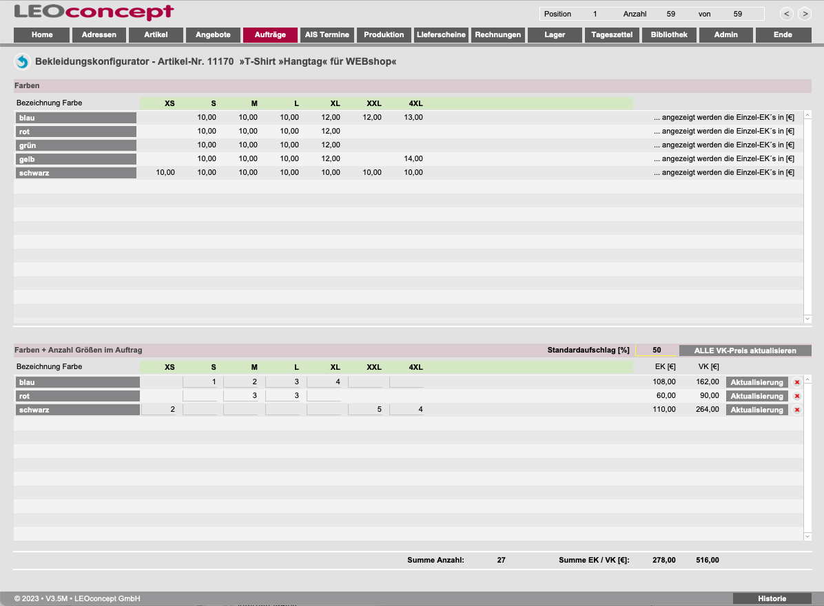 Aus diesem Grunde haben wir den Bekleidungskonfigurator entwickelt. Mit Hilfe dieses Werkzeuges wird jedes Produkt nur ein einziges Mal angelegt. Über den Konfigurator fügen Sie zunächst beliebig viele Farben hinzu, legen bis zu 12 verschiedene Größen an und erfassen einmalig, welche Kombinationen möglich sind. Jede Kombination lässt sich mit einem separaten Einkaufs- und Verkaufspreis versehen. Bei Erstellung eines Angebotes wird das Produkt nur einmal aufgenommen und die gewünschten Kombinationen angeboten.