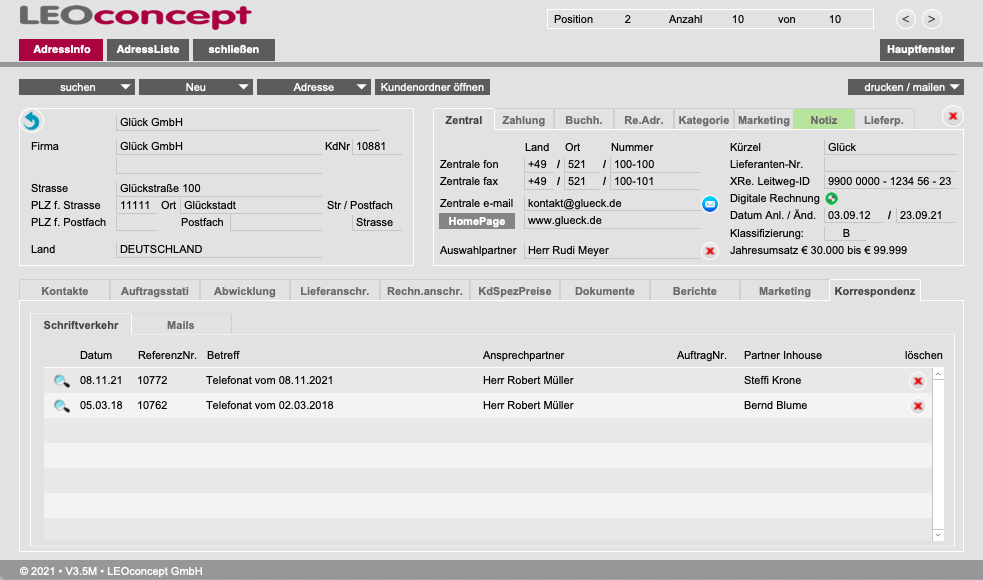 Und im Detail des Kunden werden unter »Korrespondenz« alle Briefe an den Kunde gezeigt.