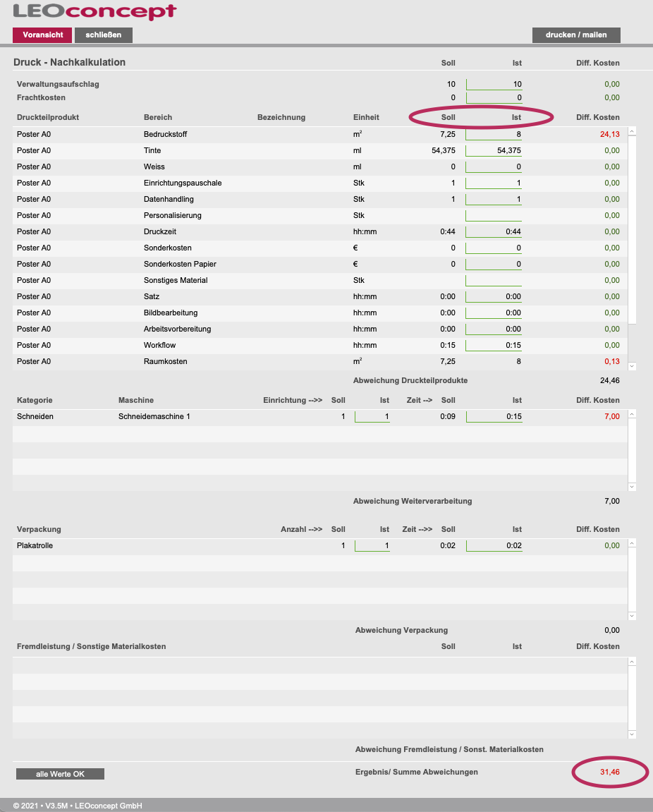 Alle Parameter werden im Druck der Nachkalkulation dargestellt und können zu jeder Zeit nachvollzogen werden.