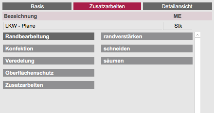Ausgehend von einem Material mit den entsprechenden Maßen sowie einer eventuellen Bedruckung des Materials lassen sich beliebig viele Zusatzarbeiten zu einer Kalkulation ergänzen. Um eine schnelle und effektive Benutzerführung zu gewährleisten, lassen sich die Zusatzarbeiten kategorisieren.