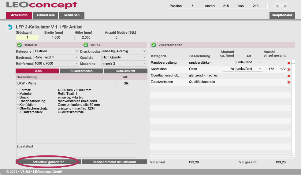 Die Abbildung zeigt den Basisbereich der Kalkulation. Auf der linken Seite erkennt man den Artikelbeschreibungstext, der automatisch aus den Leistungsmerkmalen erstellt werden kann.