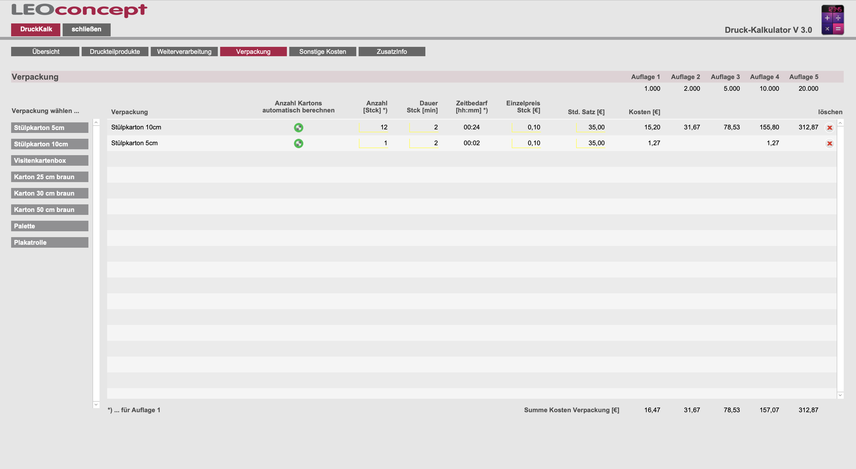 Die Nachkalkulation umfasst alle Bereiche vom Druck, über die Weiterververarbeitung und Verpackung bis hin zu den sonstigen Kosten.