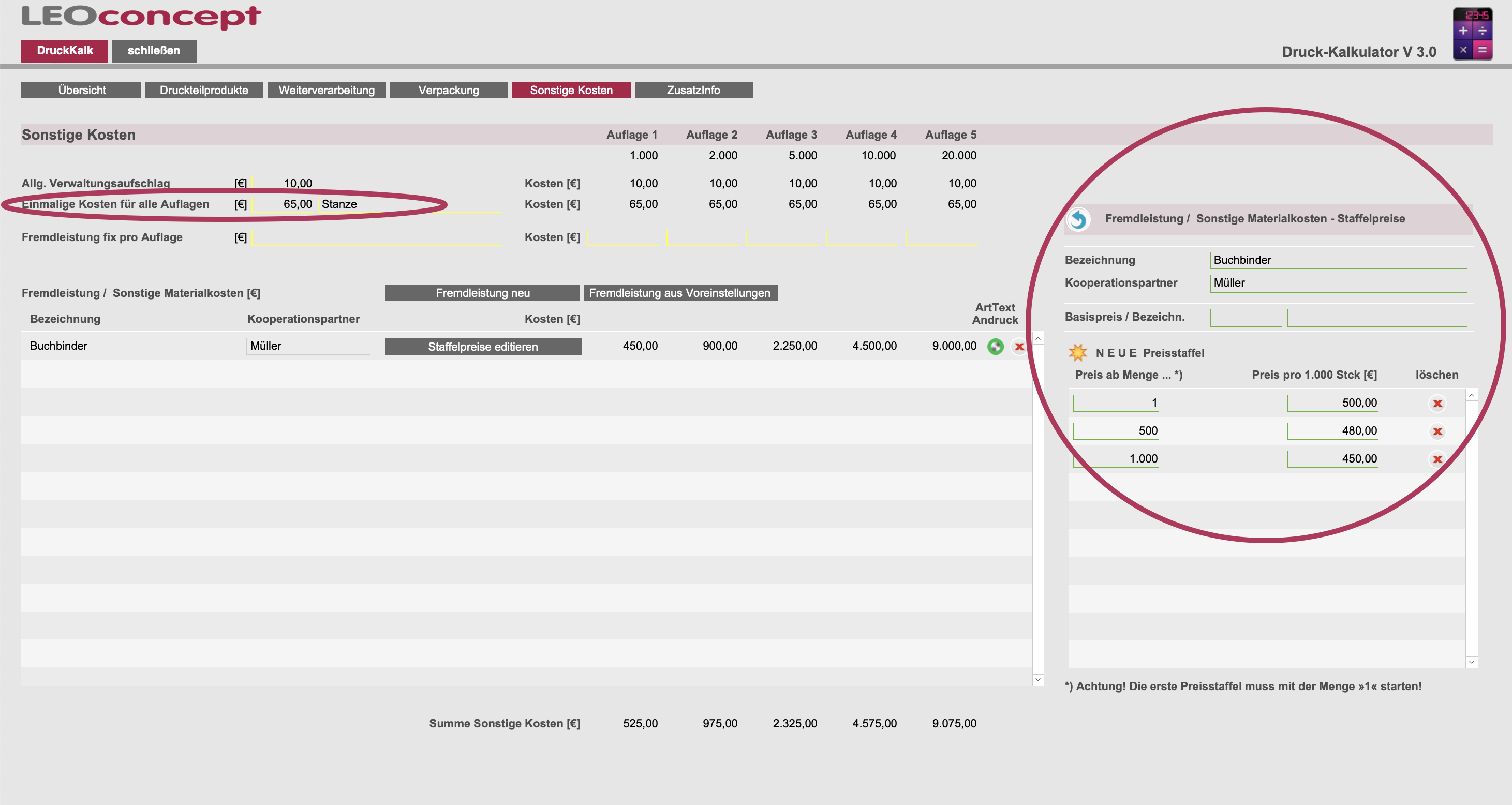 Sonstige Kosten runden diesen Bereich ab. An dieser Stelle erfassen Sie - bei Bedarf - Verwaltungskosten und weitere sonstige Kosten. Dabei unterscheiden wir zwischen »Einmalkosten« - z.B. eine Stanzform -, die für alle Auflagen identisch sind und Kosten, die für die Staffeln entsprechend hochgerechnet werden. Die Besonderheit an dieser Stelle ist, dass hier wiederum Staffelpreise angegeben werden können, die dann bei der Berechnung der »Sonstigen Kosten« für die unterschiedlichen Auflagen des Druckproduktes berücksichtigt werden.