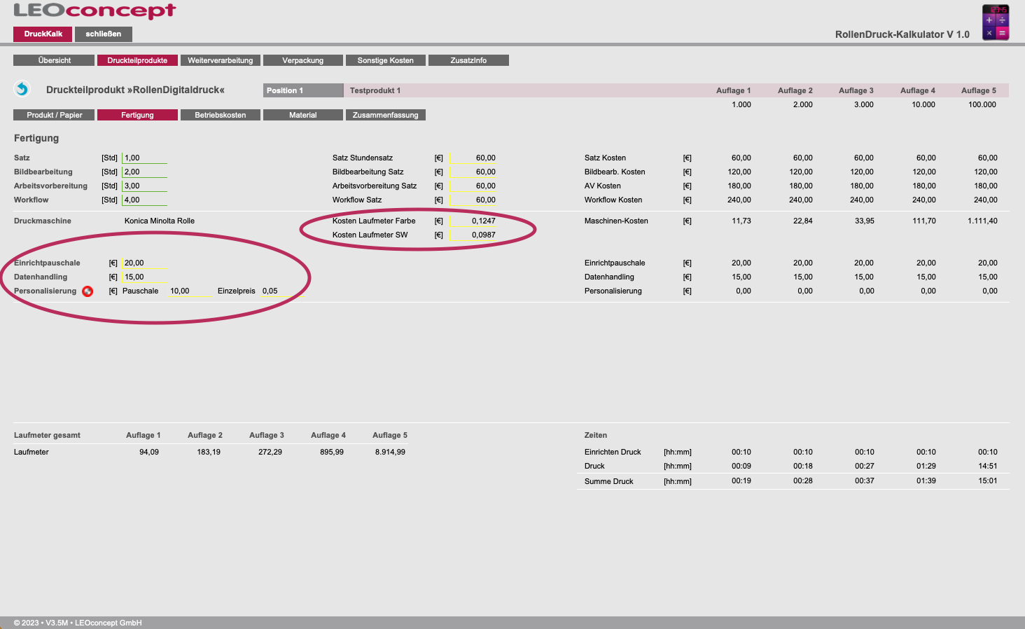 Die Kalkultion umfasst vier Teilbereiche - Produkt / Papier, Fertigung, Betriebskosten und Material. Über die Zusammenfassung erhalten Sie einen Überblick über die Zusammensetzung der Kosten sowie die Produktionszeiten.