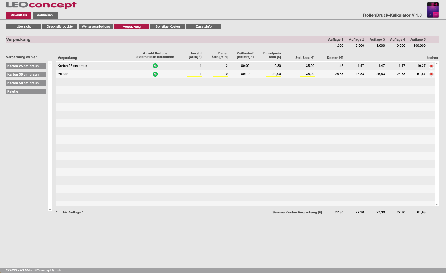 Orientiert haben wir uns bei der Entwicklung am »Look & Feel« unserer Digitaldruck-Kalkulation. Damit wird die parallele Nutzung unterschiedlicher LEOconcept-Kalkulationen zum Kinderspiel, da die Struktur für die Bedienerführung weitgehend identisch ist.