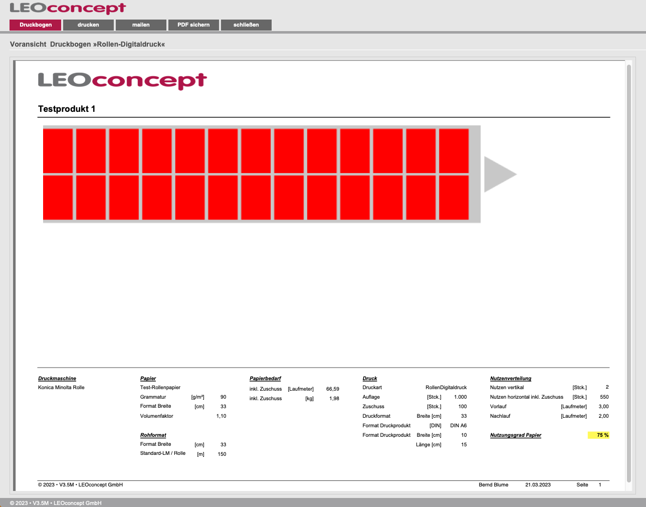 Darüber hinaus generiert das System wertvolle Informationen wie beispielsweise Papierbedarf, Nutzungsgrad des Papieres sowie per Klick eine Druckbogenansicht.