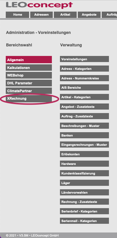 Im Admin-Bereich steht ein eigener Bereich für die XRechnung-Voreinstellungen zur Verfügung. Im Grunde genommen handelt es sich hier um Ihre Absenderdaten, die für alle XRechnungen identisch sind.