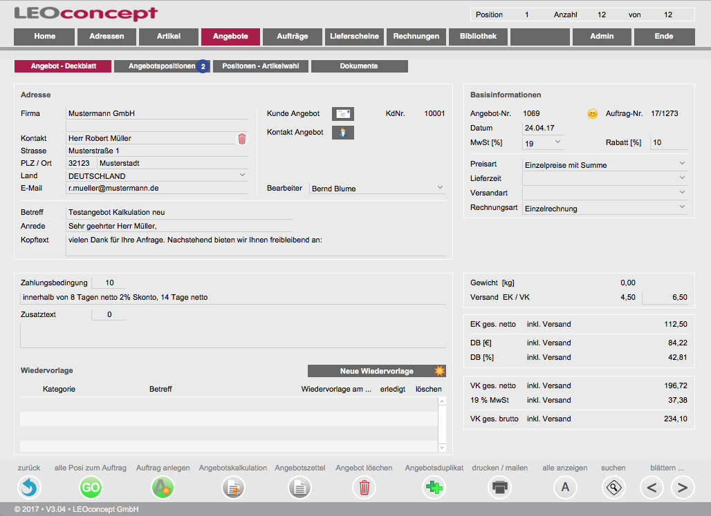 Haben Sie einen Kunden ausgewählt, können Sie einfach neue Angebote erstellen. Durch vollständige, automatische Kundendatenübernahme müssen Sie sich nur noch mit einem »Klick« um die anzubietenden Artikel kümmern.